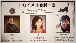 ピアニスト山根浩志、声楽家モチェオ久美、俳優・劇作家大塚恵美子のユニット。「即興性」を重視した作品を展開。「その日、その場にしか存在しないたった一つの物語」を生み出す。